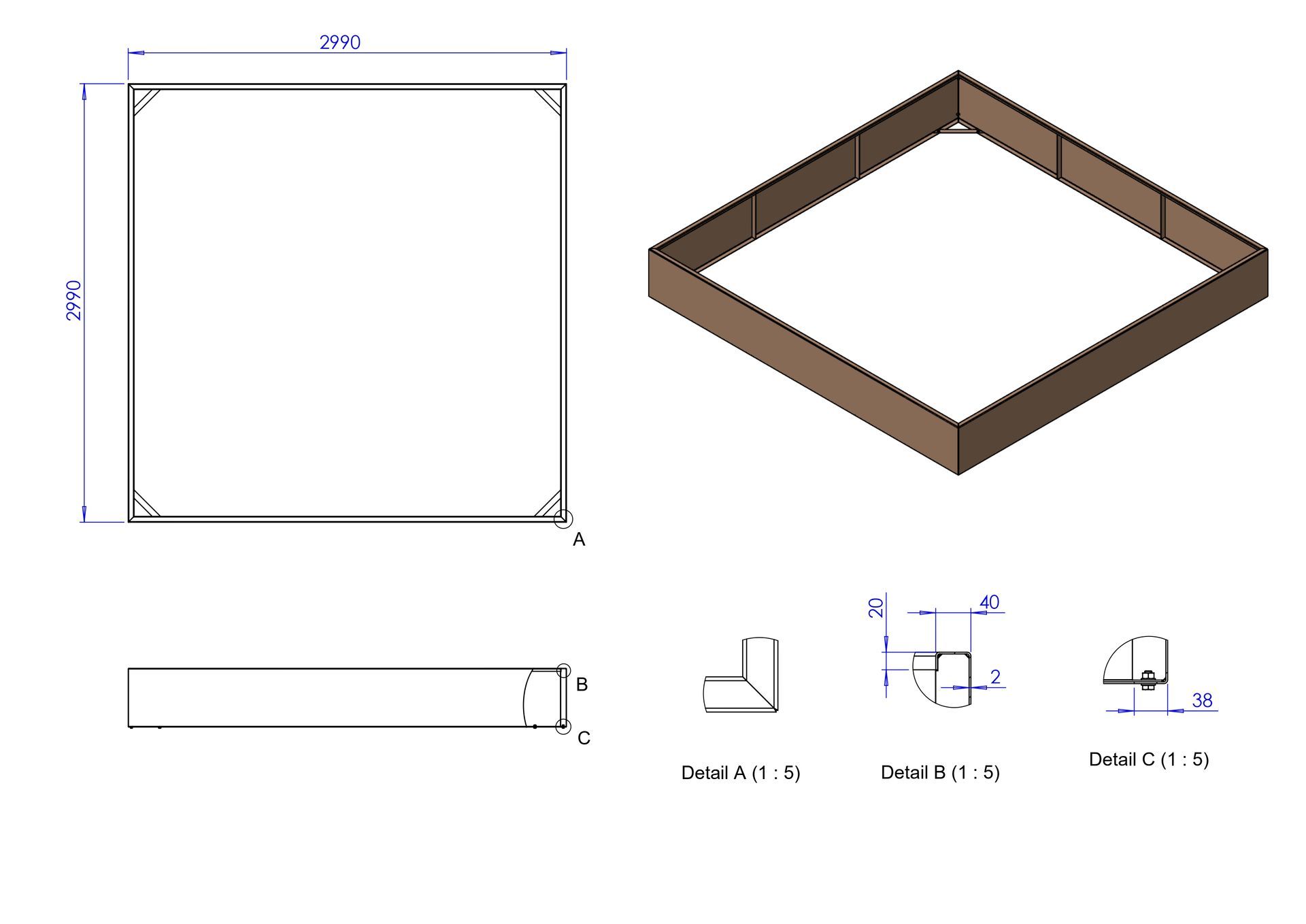 Plantenbak 300x300x40cm 2mm, gebout, zonder bodem