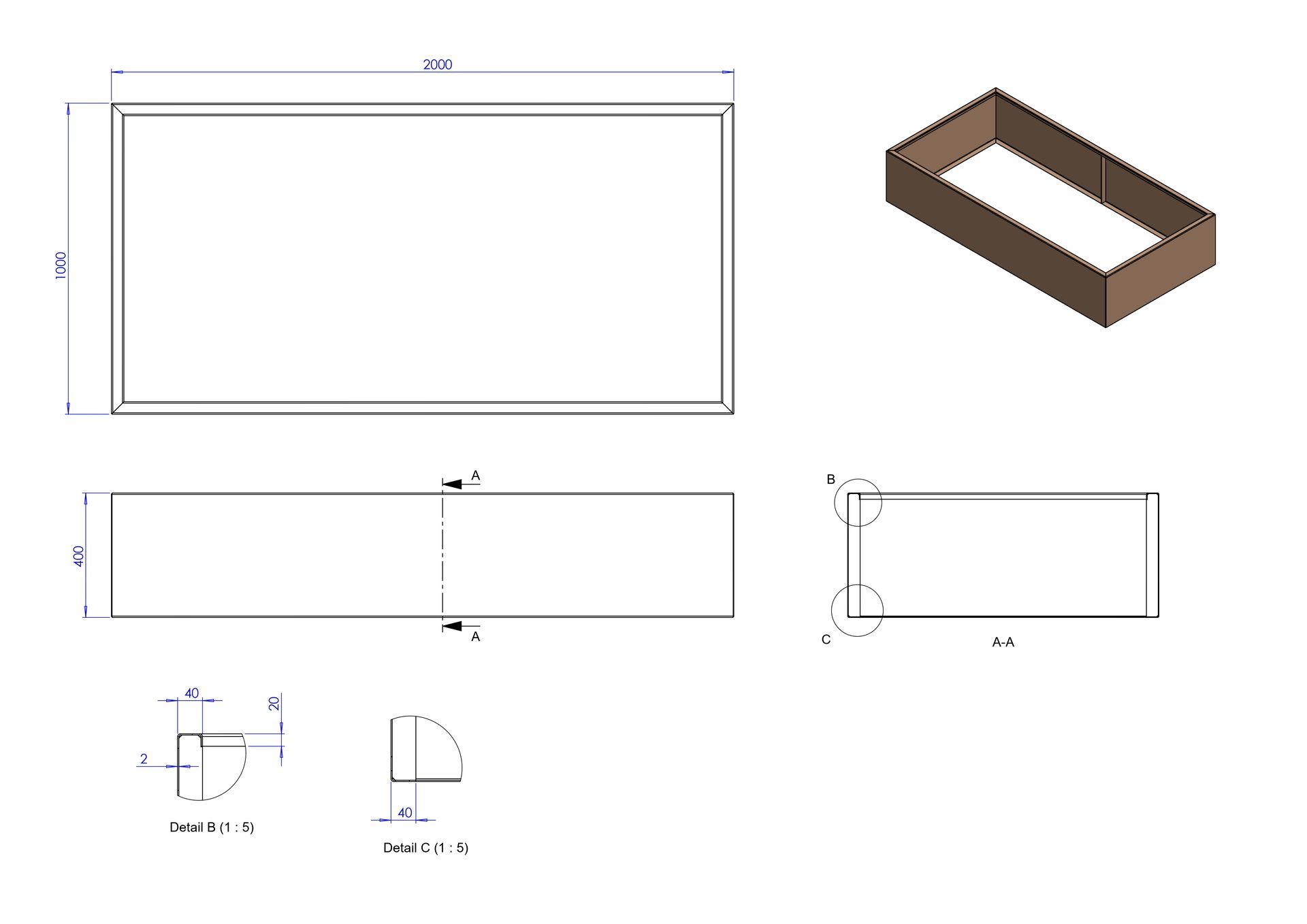 Plantenbak 200x100x40cm 2mm, gelast, zonder bodem